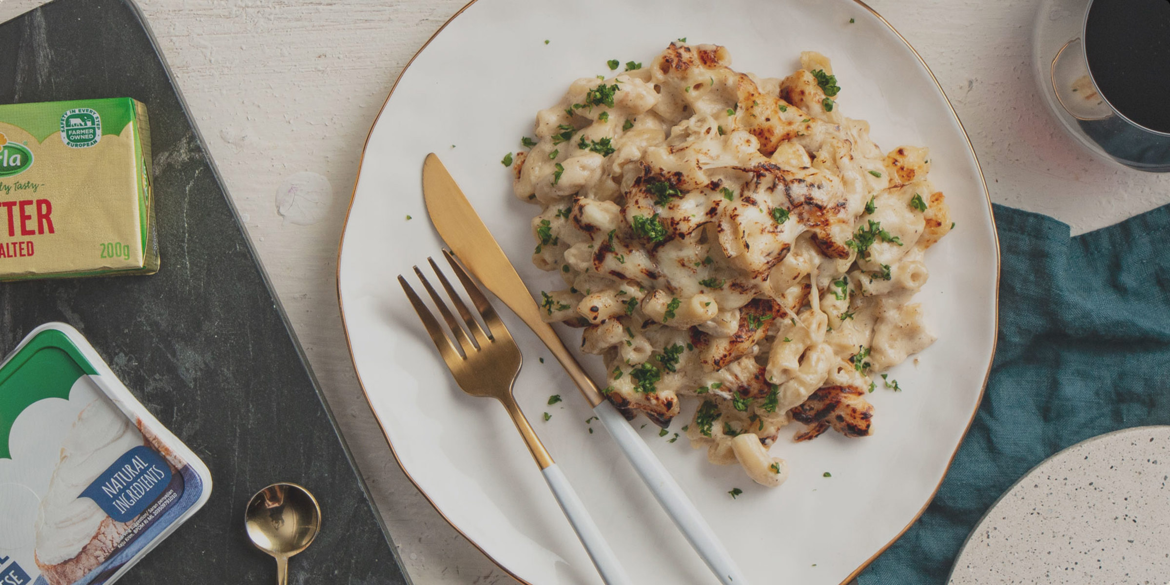 - Add the remaining two tablespoons of Arla Unsalted Butter, Arla Natural Cream Cheese Plain and 1 cup Arla Natural Mozzarella Shredded.